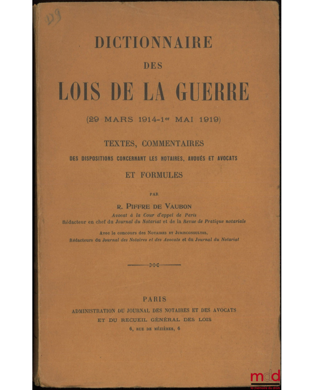 DICTIONNAIRE DES LOIS DE LA GUERRE (29 mars 1914 - 1er mai 1919), Textes, Commentaires des dispositions concernant les notaires, avoués et avocats, et formules