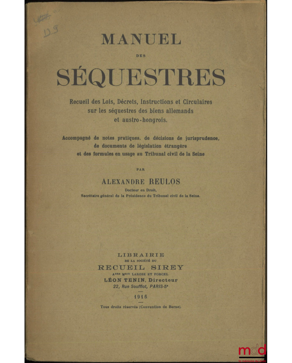 MANUEL DES SÉQUESTRES, Recueil des Lois, Décrets, Instructions et Circulaires sur les séquestres des biens allemands et austro-hongrois, Accompagné de notes pratiques, de décisions de jurisprudence, de documents de législation étrangère et des formules en usage au Tribunal civil de la Seine