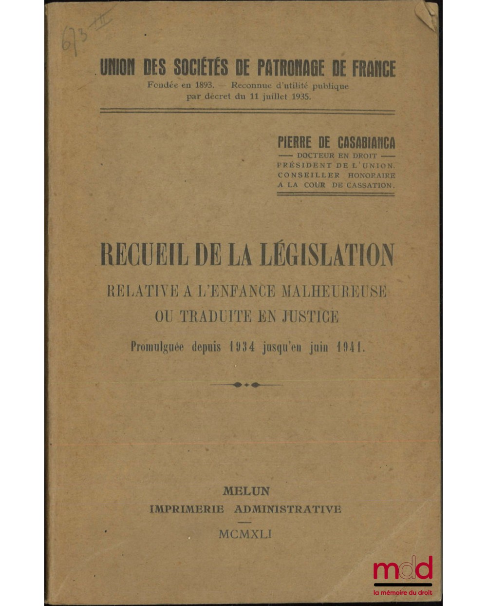 RECUEIL DE LA LÉGISLATION RELATIVE À L’ENFANCE MALHEUREUSE OU TRADUITE EN JUSTICE, Promulguée depuis 1934 jusqu’en juin 1941, Union des sociétés de patronage de France