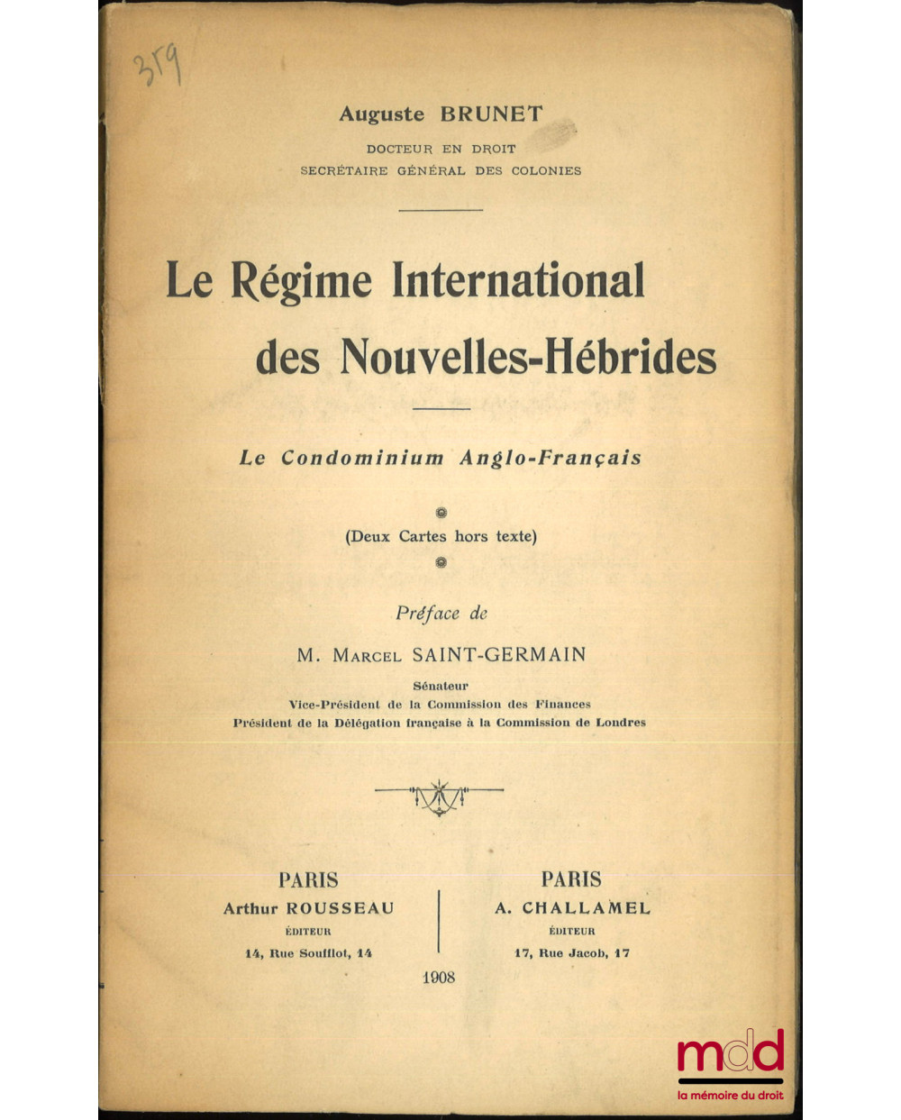 LE RÉGIME INTERNATIONAL DES NOUVELLES-HÉBRIDES, Le condominium Anglo-Français, Deux cartes hors texte, Préface de Marcel Saint-Germain