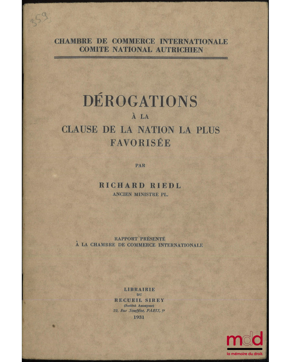 DÉROGATIONS À LA CLAUSE DE LA NATION LA PLUS FAVORISÉE, Rapport présenté à la chambre de commerce internationale, Chambre de commerce internationale, Comité national autrichien