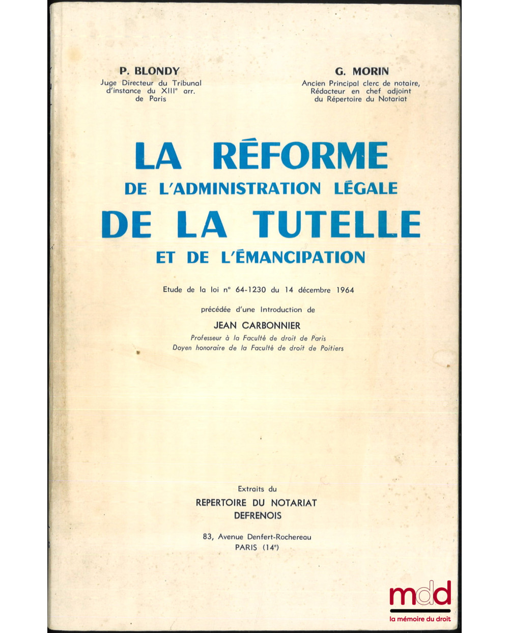 LA RÉFORME DE L’ADMINISTRATION LÉGALE DE LA TUTELLE ET DE L’ÉMANCIPATION, Étude de la loi n° 64-1230 du 14 décembre 1964 précédée d’une introduction de Jean Carbonnier