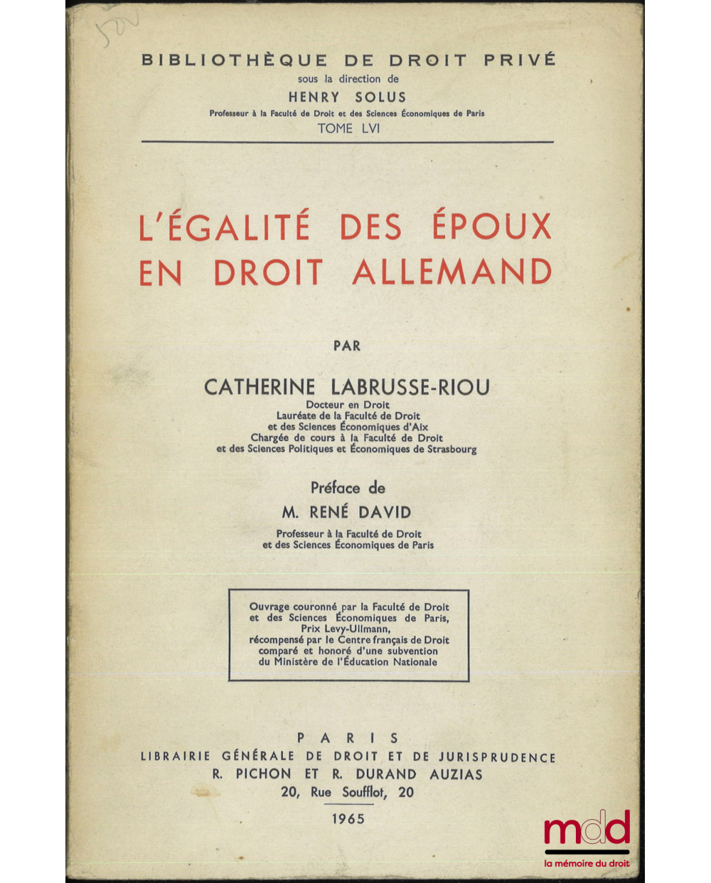 L’ÉGALITÉ DES ÉPOUX EN DROIT ALLEMAND, Préface de René David, Bibl. de droit privé, t. LVI
