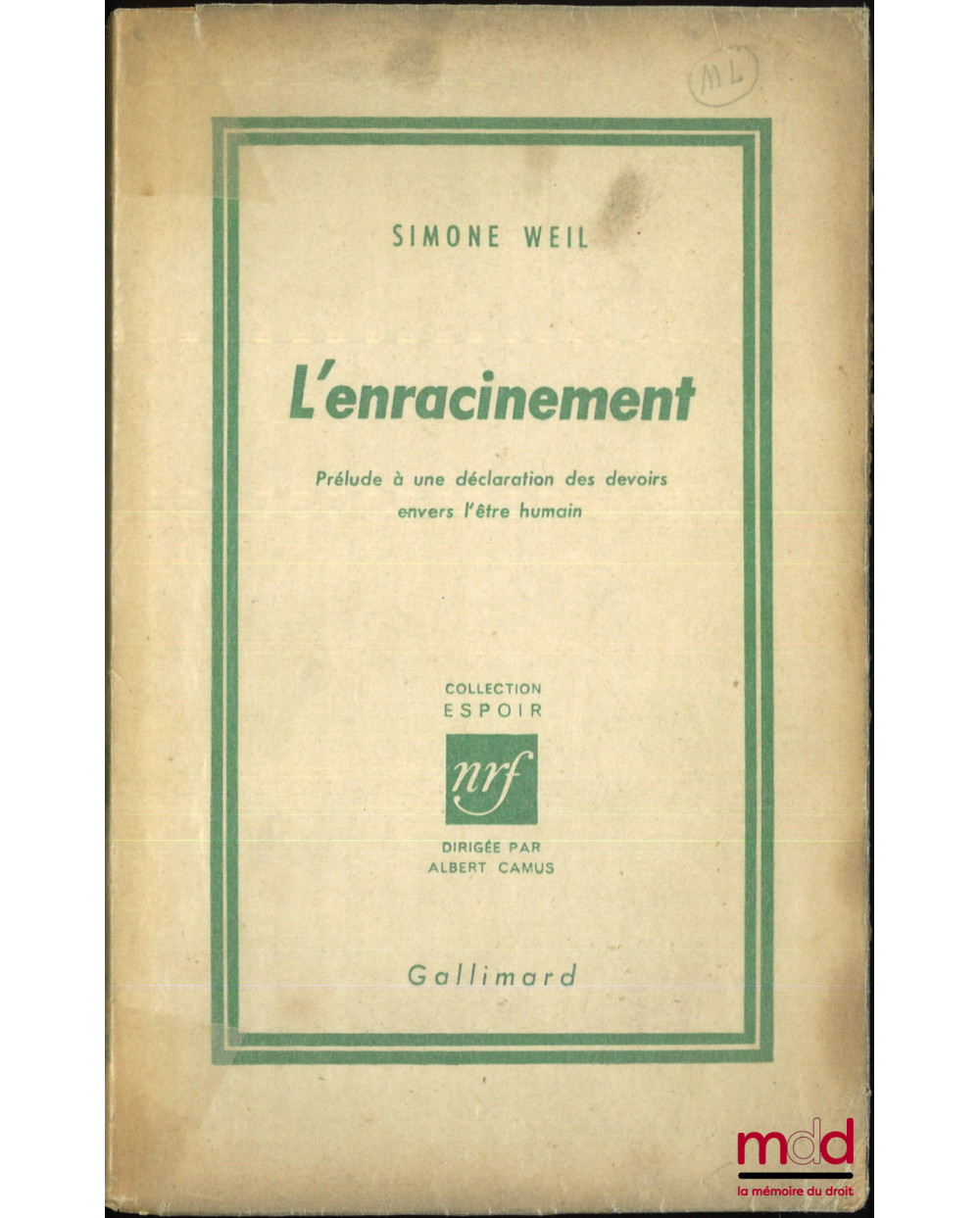 L’ENRACINEMENT, Prélude à une déclaration des devoirs envers l’être humain, coll. Espoir