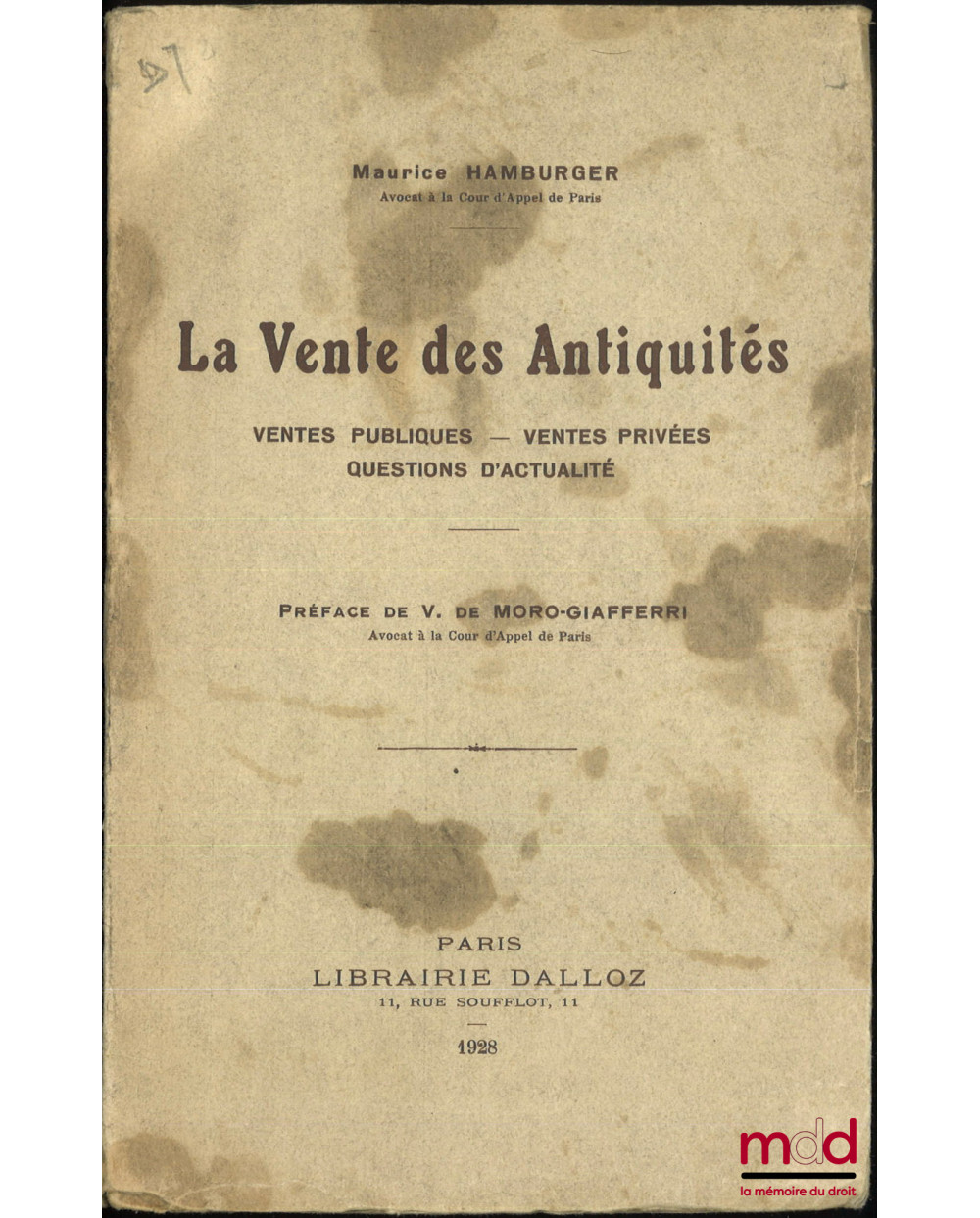 LA VENTE DES ANTIQUITÉS, Ventes publiques - Ventes privées - Questions d’actualité, Préface de Vincent de Moro-Giafferri