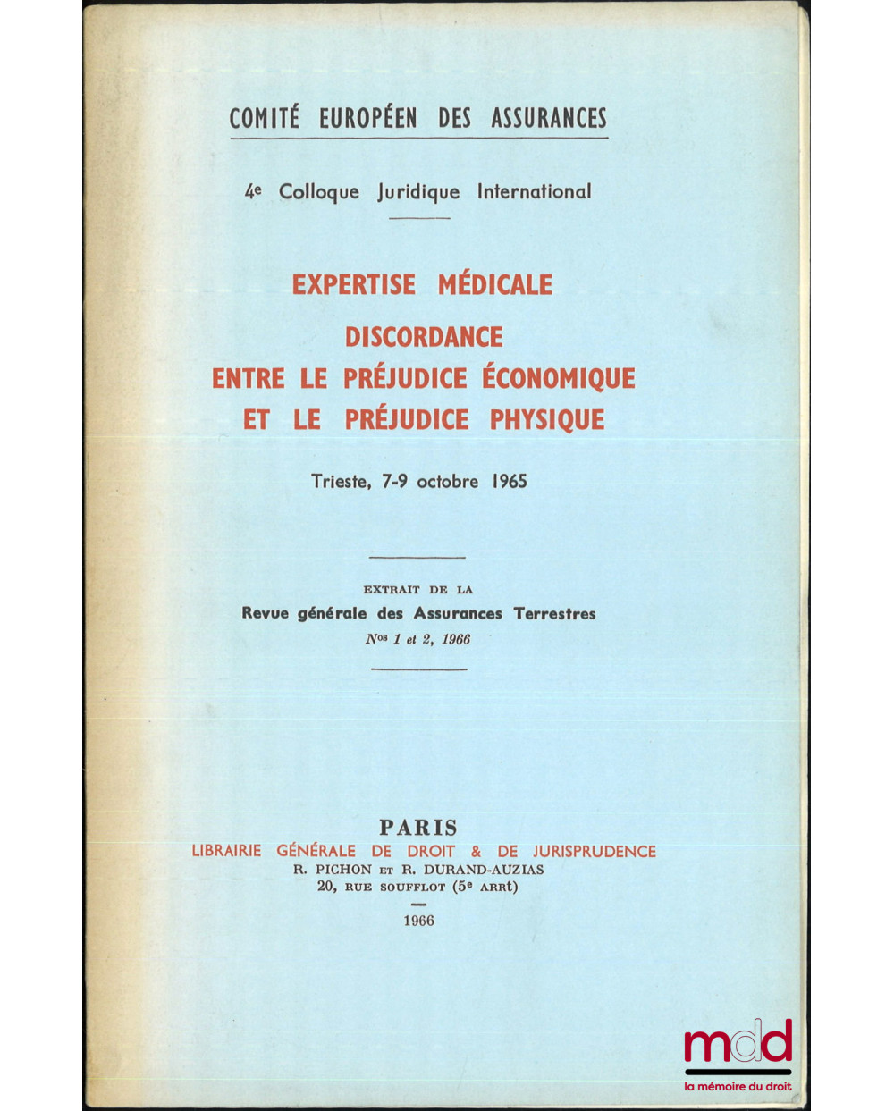 EXPERTISE MÉDICALE, DISCORDANCE ENTRE LE PRÉJUDICE ÉCONOMIQUE ET LE PRÉJUDICE PHYSIQUE, Trieste 7-9 octobre 1965, 4e colloque juridique international, Extrait de la Revue générale des Assurances Terrestres, nos 1 et 2