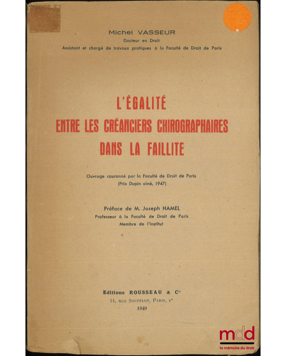 L’ÉGALITÉ ENTRE LES CRÉANCIERS CHIROGRAPHAIRES DANS LA FAILLITE, Préface de Joseph Hamel