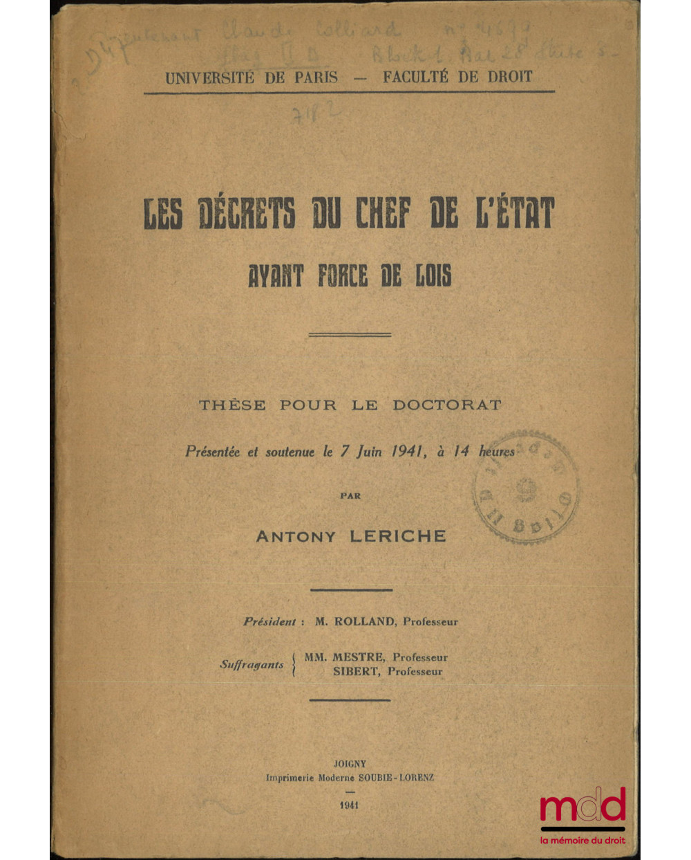LES DÉCRETS DU CHEF DE L’ÉTAT AYANT FORCE DE LOIS, Thèse (Président : M. Rolland ; Suffragants : MM. Mestre et Sibert), Université de Paris - Faculté de droit