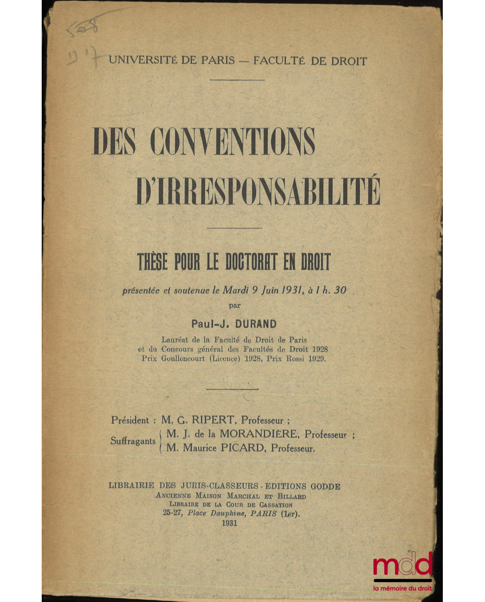 LES CONVENTIONS D’IRRESPONSABILITÉ, Thèse (Président : M. G. Ripert ; Suffragants : M. J. de la Morandière, M. Maurice Picard), Université de Paris - Faculté de droit