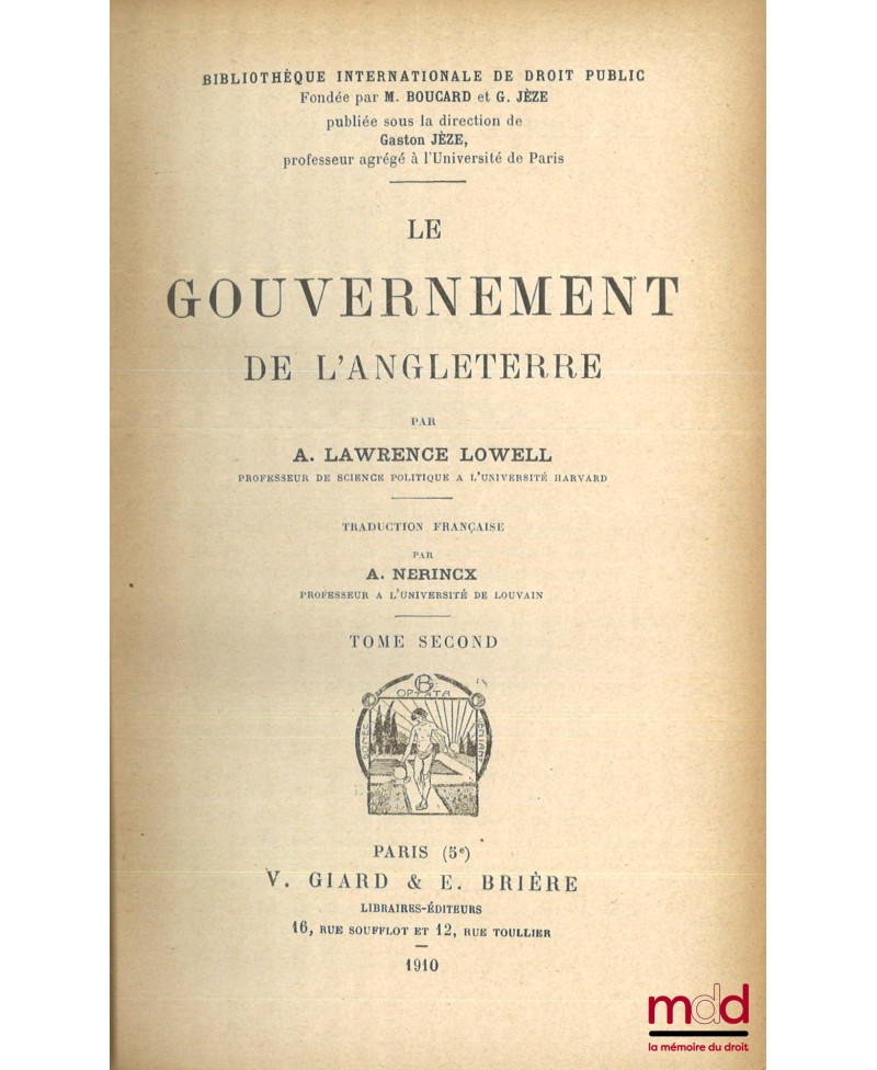 LE GOUVERNEMENT DE L’ANGLETERRE, Traduction par A. Nerincx, Bibl. internationale de droit public [mq. le t. I]