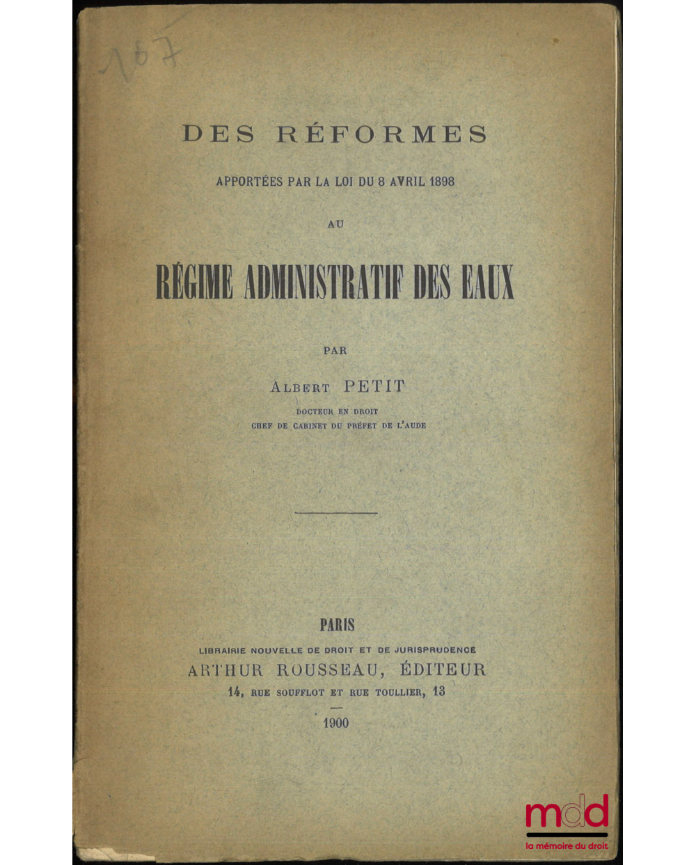 DES RÉFORMES APPORTÉES PAR LA LOI DU 8 AVRIL 1898 AU RÉGIME ADMINISTRATIF DES EAUX