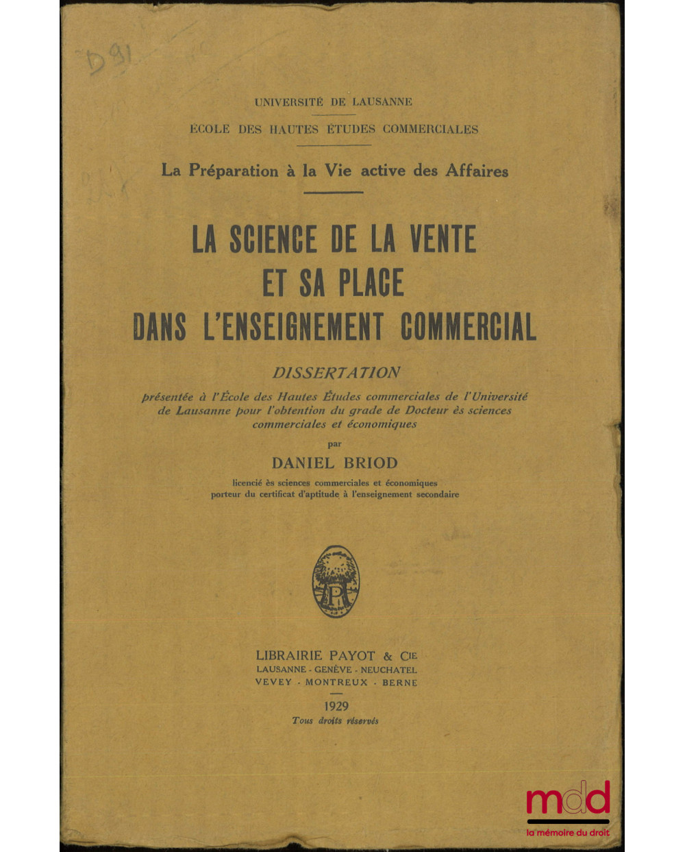LA SCIENCE DE LA VENTE ET SA PLACE DANS L’ENSEIGNEMENT COMMERCIAL, Dissertation, Université de Lausanne, École des Hautes Études commerciales