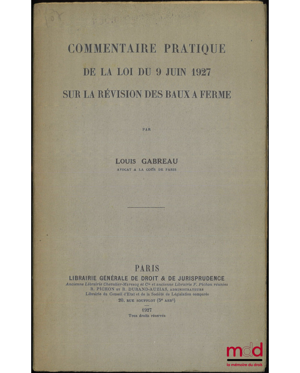 COMMENTAIRE PRATIQUE DE LA LOI DU 9 JUIN 1927 SUR LA RÉVISION DES BAUX À FERME