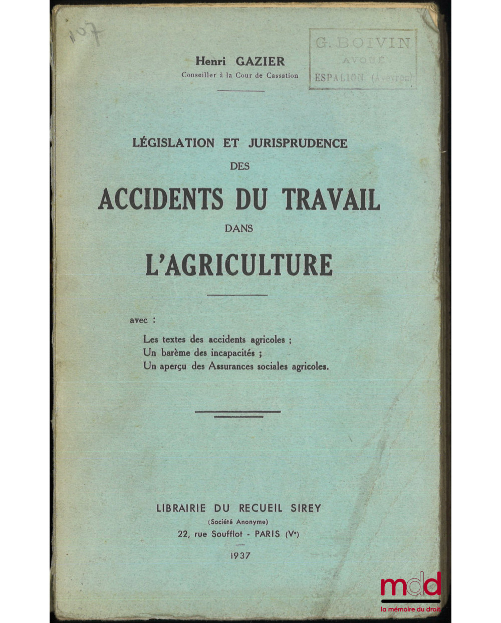 LÉGISLATION ET JURISPRUDENCE DES ACCIDENTS DU TRAVAIL DANS L’AGRICULTURE, avec : Les textes des accidents agricoles ; Un barème des incapacités ; Un aperçu des Assurances sociales agricoles