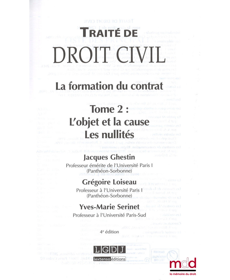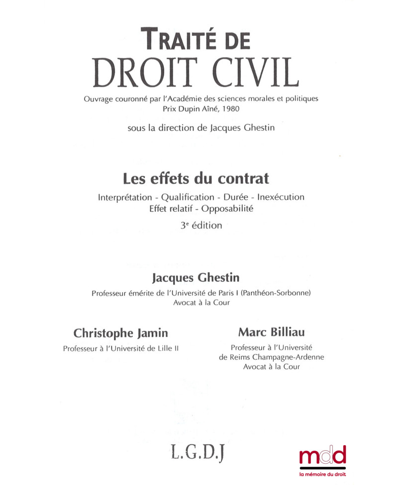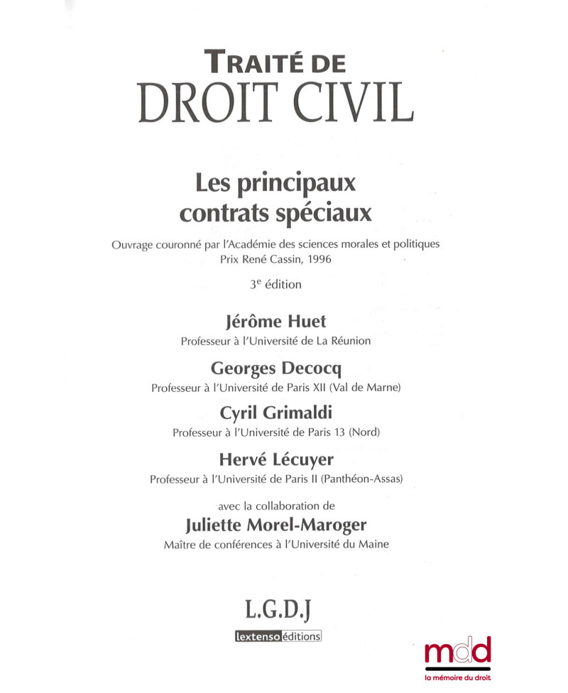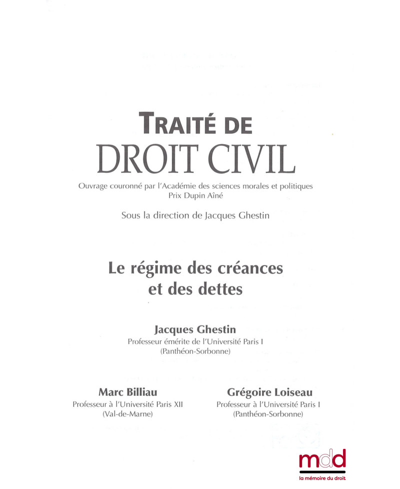 TRAITÉ DE DROIT CIVIL, sous la direction de Jacques Ghestin :– LA FORMATION DU CONTRAT, t. II : L’objet et la cause - Les nullités, (4e éd., 2013) ;– LES EFFETS DU CONTRAT, (3e éd., 2001) ;– LE RÉGIME DES CRÉANCES ET DES DETTES, (2005) ;– LES BIENS, (2e éd., 2010) ;– LES PRINCIPAUX CONTRATS SPÉCIAUX, (3e éd., 2012)