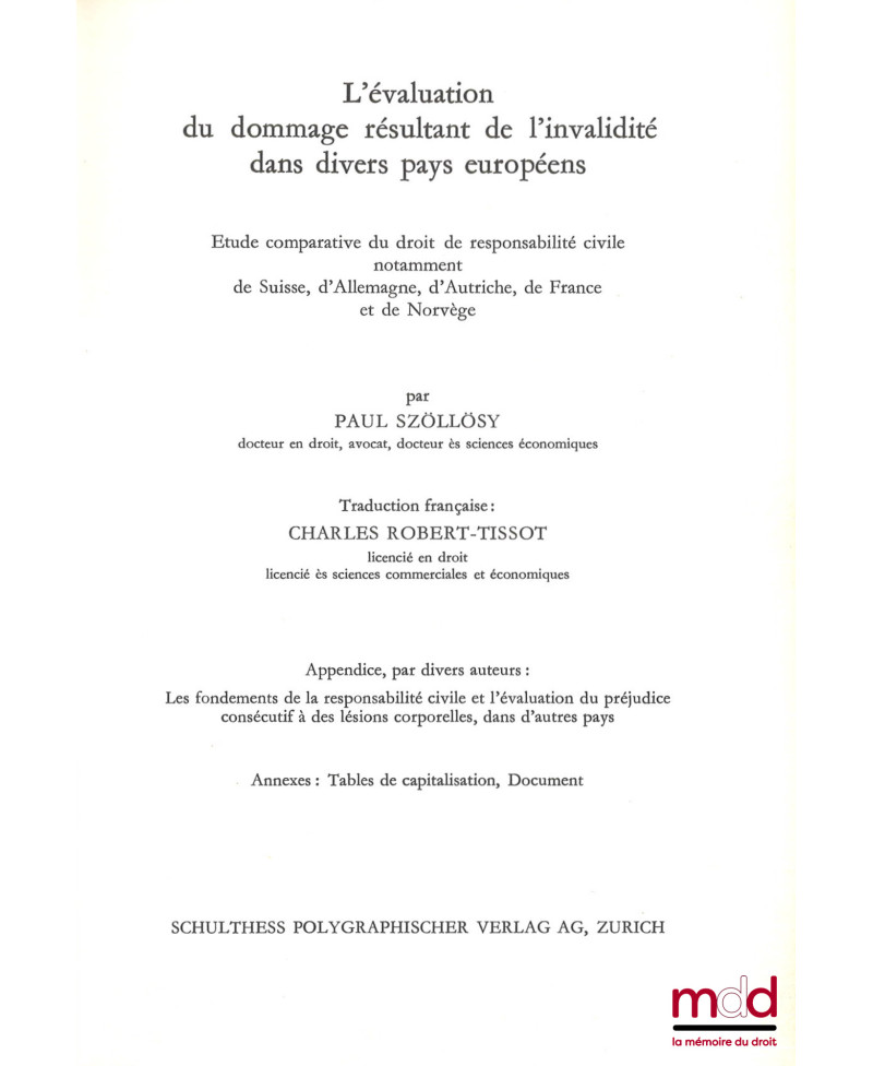 L’ÉVALUATION DU DOMMAGE RÉSULTANT DE L’INVALIDITÉ DANS DIVERS PAYS EUROPÉENS, Étude comparative du droit de responsabilité civile notamment de Suisse, d’Allemagne, d’Autriche, de France et de Norvège, Traduction française : Charles Robert-Tissot