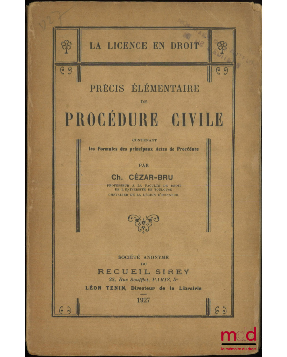 Cézar-Bru un des auteurs les plus connus en matière de procédure civile est notamment l’auteur d’un traité. Le précis, ici présenté et particulièrement rare, est un abrégé de son traité.