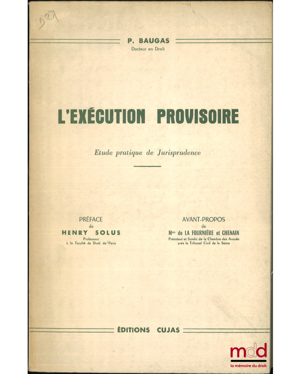 L’EXÉCUTION PROVISOIRE, Étude pratique de jurisprudence, Préface de Henry Solus, Avant-propos de Mes de La Fournière et Chenain