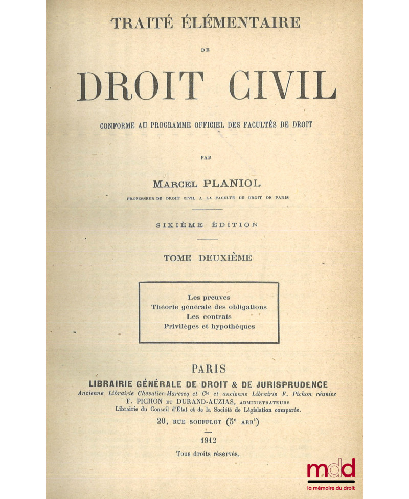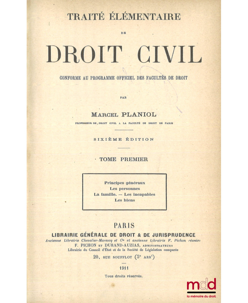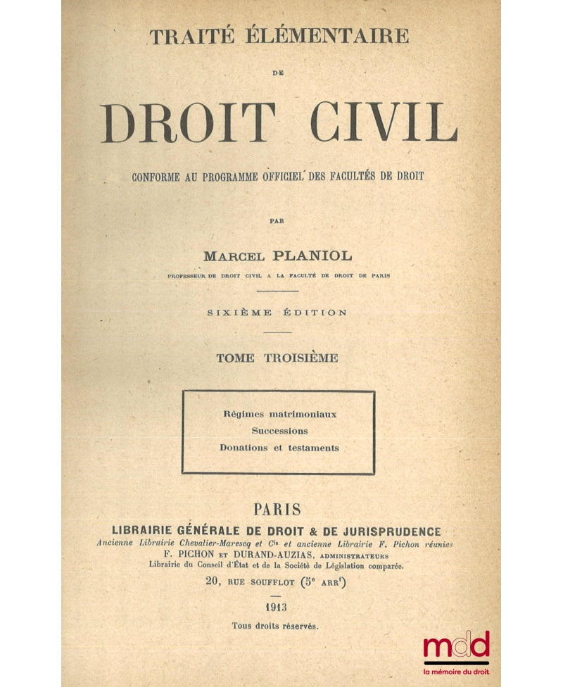Édition homogène du traité de Marcel Planiol rédigé encore sans le concours de G. Ripert.
