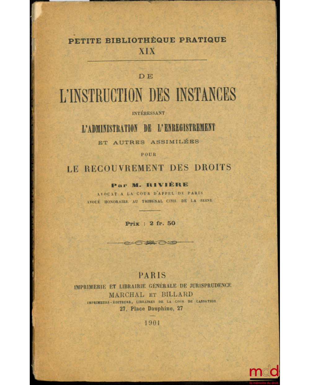 DE L’INSTRUCTION DES INSTANCES INTÉRESSANT L’ADMINISTRATION DE L’ENREGISTREMENT ET AUTRES ASSIMILÉES POUR LE RECOUVREMENT DES DROITS, coll. Petite bibliothèque pratique t. XIX