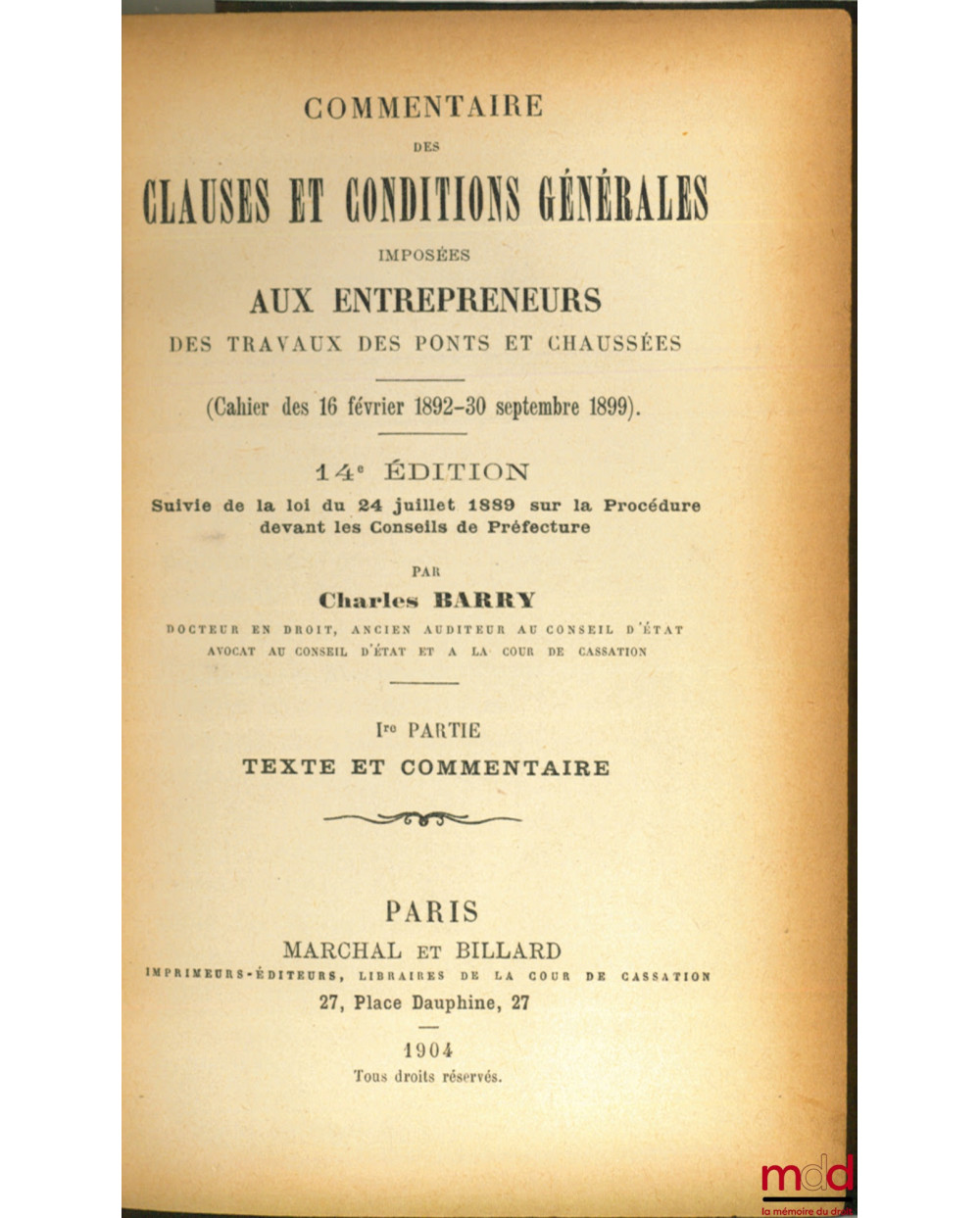 COMMENTAIRE DES CLAUSES ET CONDITIONS GÉNÉRALES IMPOSÉES AUX ENTREPRENEURS DES TRAVAUX DES PONTS ET CHAUSSÉES, (Cahier des 16 février 1892 - 30 septembre 1899). 14ème édition suivie de la loi du 24 juillet 1889 sur la Procédure devant les Conseils de Préfecture, 1ère partie : Texte et commentaire
