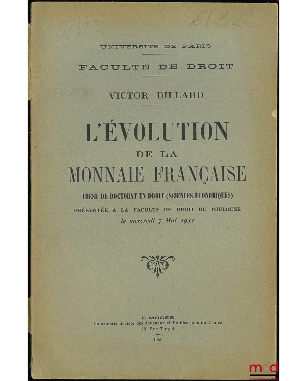 L’ÉVOLUTION DE LA MONNAIE FRANÇAISE, Université de Paris, Faculté de droit