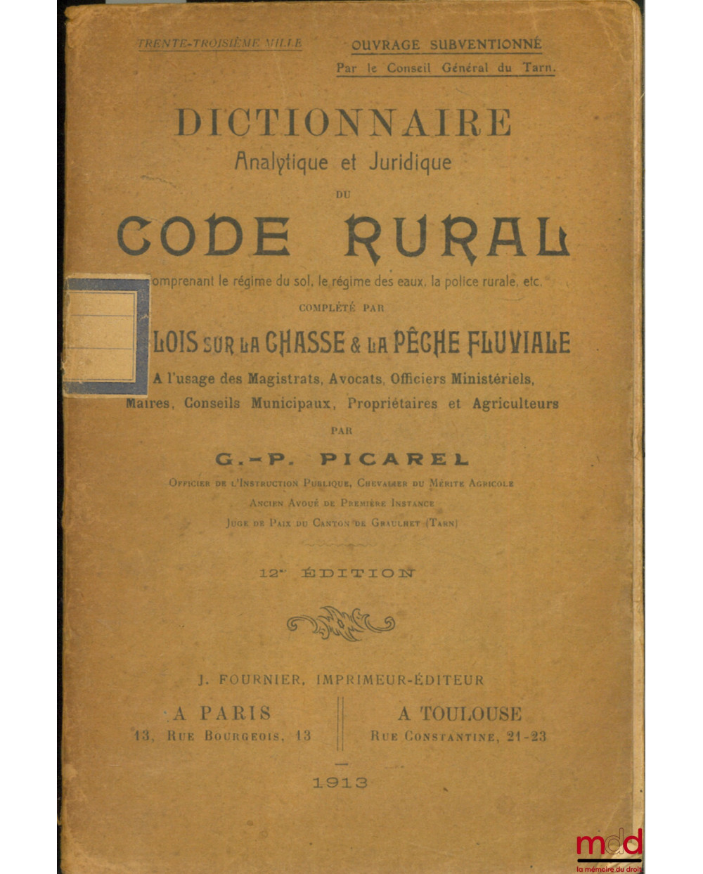 DICTIONNAIRE ANALYTIQUE ET JURIDIQUE DU CODE RURAL comprenant le régime du sol, le régime des eaux, la police rurale, etc., complété par LES LOIS SUR LA CHASSE ET LA PÊCHE FLUVIALE, 12e éd.