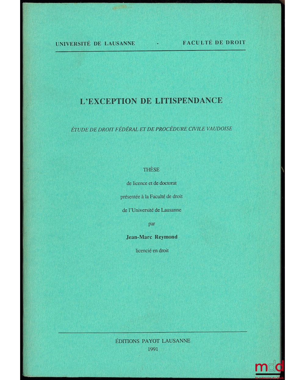 L’EXCEPTION DE LITISPENDANCE. Étude de droit fédéral et de procédure civile vaudoise, Université de Lausanne, Faculté de droit