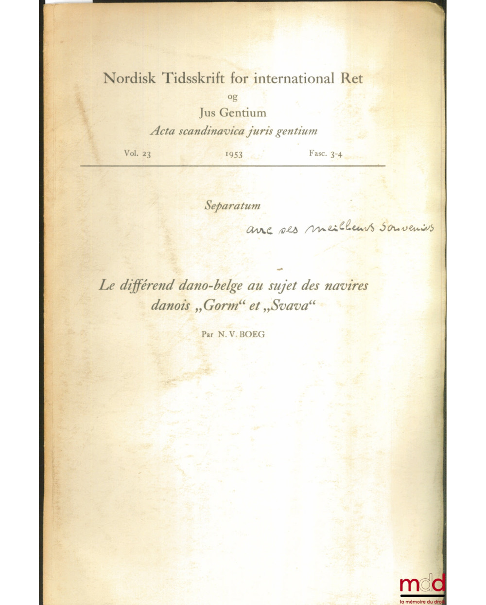 LE DIFFÉREND DANO-BELGE AU SUJET DES NAVIRES DANOIS “GORM” ET “SVAVA”, extrait de la revue Nordisk Tidsskrift for international Ret og Jus Gentium, vol. 23, fasc. 3-4, 1953