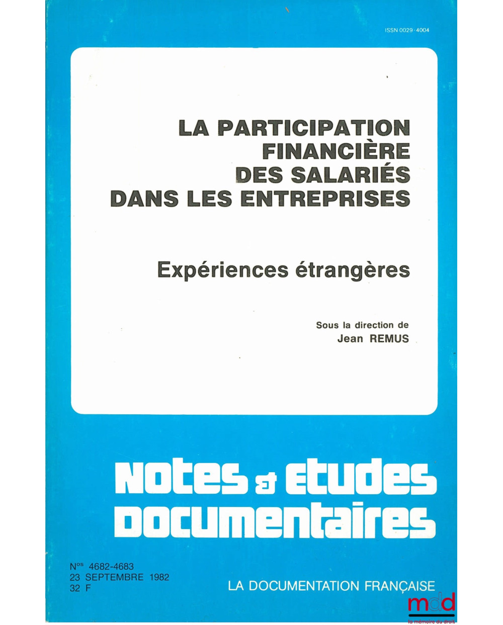 LA PARTICIPATION FINANCIÈRE DES SALARIÉS DANS LES ENTREPRISES. EXPÉRIENCES ÉTRANGÈRES, sous la direction de Jean REMUS, coll. Notes & études documentaires