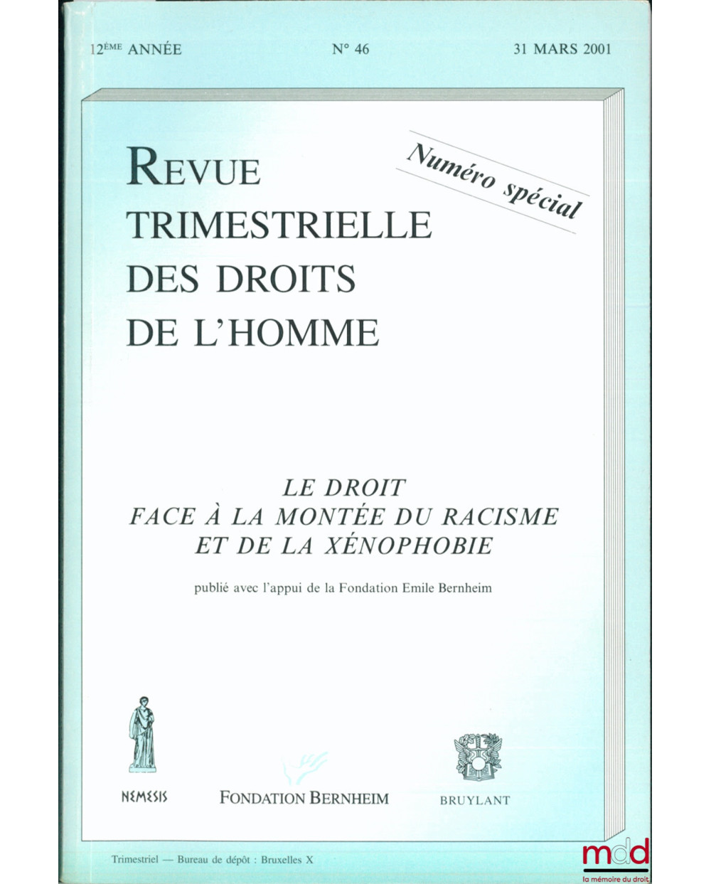 LE DROIT FACE À LA MONTÉE DU RACISME ET DE LA XÉNOPHOBIE, numéro spécial de la Revue trim. des Droits de l’Homme, n° 46 du 31 mars 2001, publié avec l’appui de la fondation Émile Bernheim