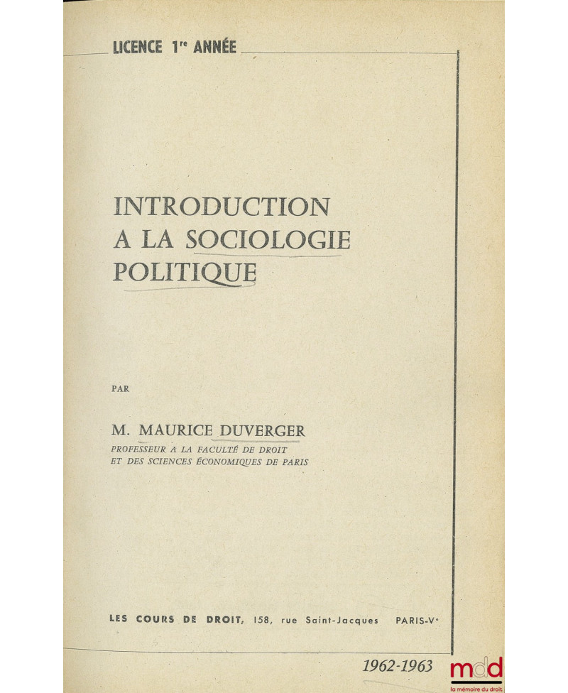 INTRODUCTION À LA SOCIOLOGIE POLITIQUE, cours de licence 1re année 1962-1963 et COURS DE SCIENCE POLITIQUE, D.E.S. 1959-1960