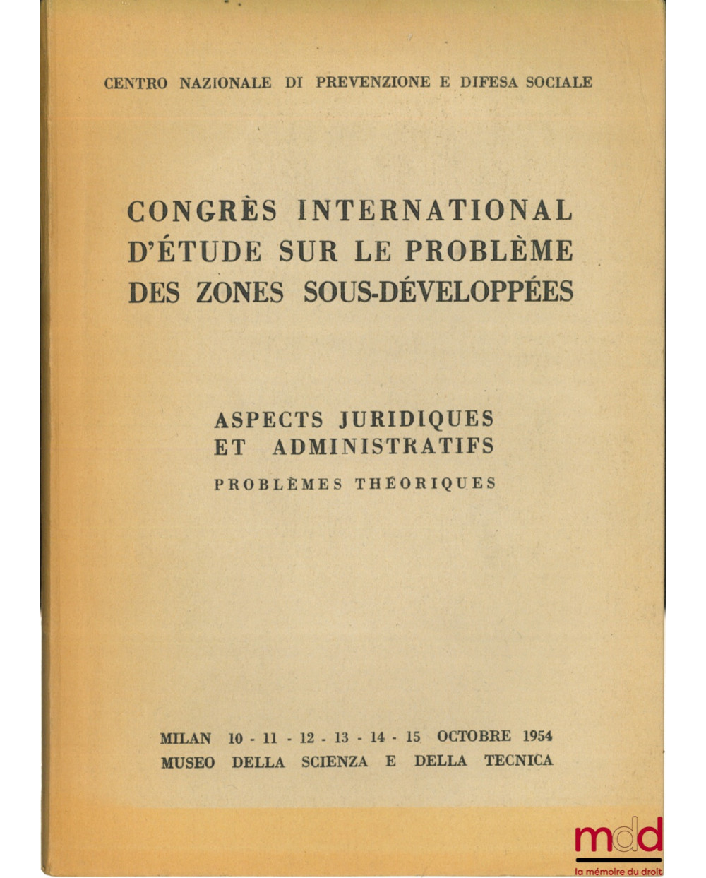 CONGRÈS INTERNATIONAL D’ÉTUDE SUR LE PROBLÈME DES ZONES SOUS-DÉVELOPPÉES - ASPECTS JURIDIQUES ET ADMINISTRATIFS. PROBLÈMES THÉORIQUES ; Centro nazionale di prevenzione e difesa sociale, Milan les 10 - 15 octobre 1954 ; éd. française