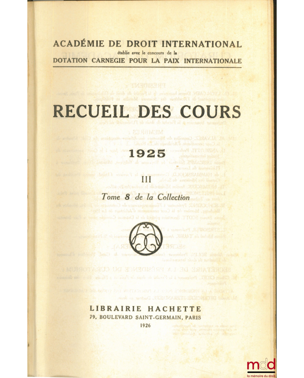 RECUEIL DES COURS, Académie de droit international, 1925 -III, t. 8 de la collection