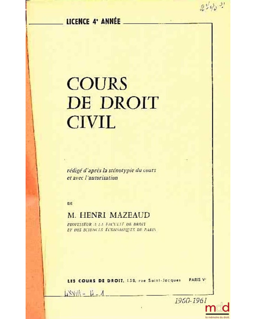 COURS DE DROIT CIVIL, Licence 4ème année, 1960-1961