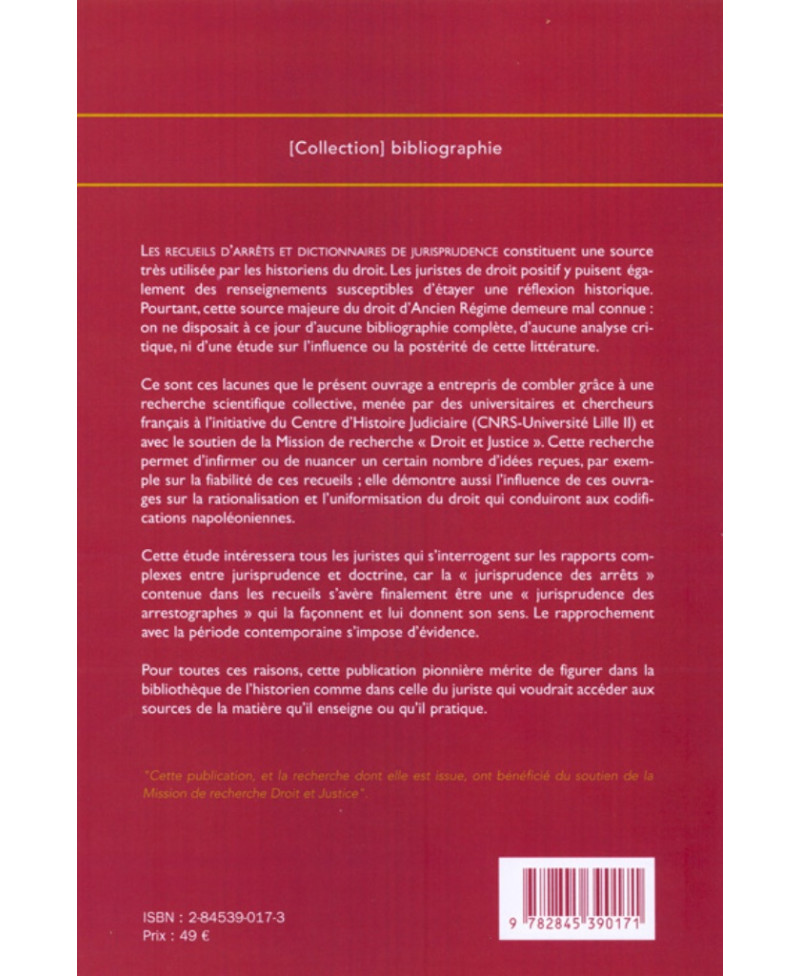 Les recueils d’arrêts et dictionnaires de jurisprudence constituent une source très utilisée par les historiens du droit. Les juristes de droit positif y puisent également des renseignements susceptibles d’étayer une réflexion historique. Pourtant, cette source majeure du droit d’Ancien Régime demeure mal connue : on ne disposait à ce jour d’aucune bibliographie complète, d’aucune analyse critique, ni d’une étude sur l’influence ou la postérité de cette littérature.Ce sont ces lacunes que le présent ouvrage a entrepris de combler grâce à une recherche scientifique collective, menée par des universitaires et chercheurs français à l’initiative du Centre d’Histoire Judiciaire (CNRS-Université Lille II) et avec le soutien de la Mission de recherche « Droit et Justice ». Cette recherche permet d’infirmer ou de nuancer un certain nombre d’idées reçues, par exemple sur la fiabilité de ces recueils ; elle démontre aussi l’influence de ces ouvrages sur la rationalisation et l’uniformisation du droit qui conduiront aux codifications napoléoniennes.Cette étude intéressera tous les juristes qui s’interrogent sur les rapports complexes entre jurisprudence et doctrine, car la « jurisprudence des arrêts » contenue dans les recueils s’avère finalement être une « jurisprudence des arrestographes » qui la façonnent et lui donnent son sens. Le rapprochement avec la période contemporaine s’impose d’évidence.Pour toutes ces raisons, cette publication pionnière mérite de figurer dans la bibliothèque de l’historien comme dans celle du juriste qui voudrait accéder aux sources de la matière qu’il enseigne ou qu’il pratique.