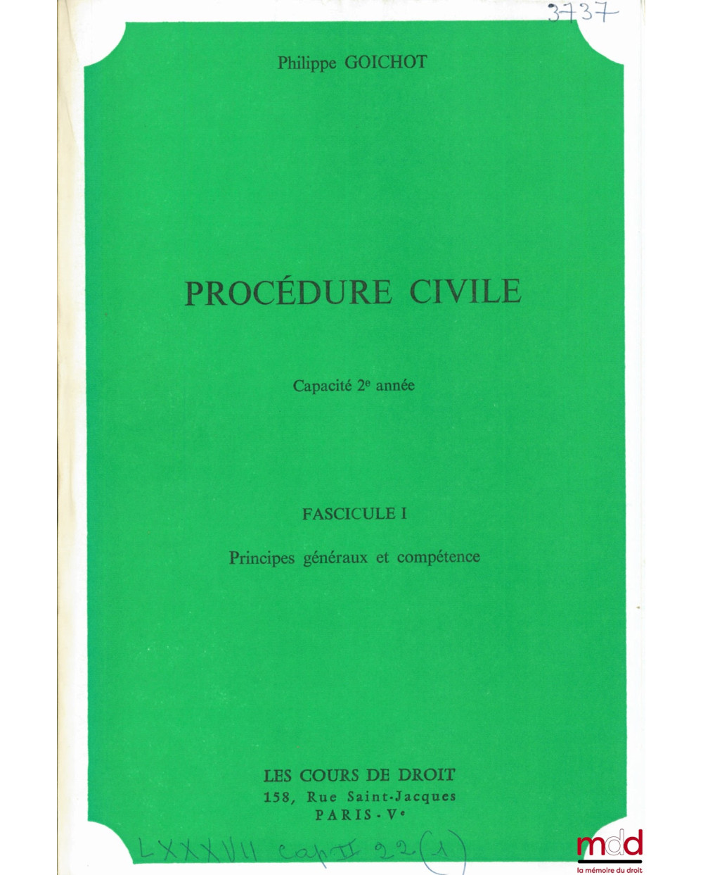 PROCÉDURE CIVILE, fasc. I : PRINCIPES GÉNÉRAUX ET COMPÉTENCE, fasc. II : DÉROULEMENT DE L’INSTANCE ET VOIES DE RECOURS, Capacité 2ème année 1978-1979