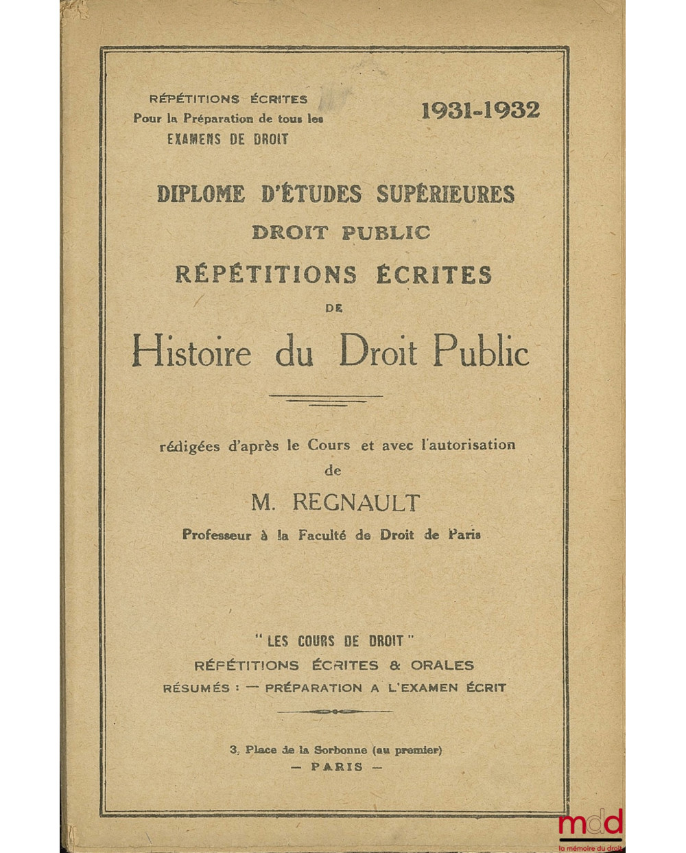 RÉPÉTITION ÉCRITES D’HISTOIRE DU DROIT PUBLIC, D.E.S. Droit public année 1931-1932