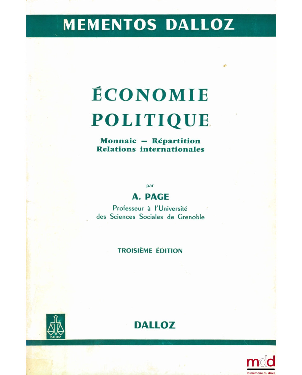 ÉCONOMIE POLITIQUE 2ème année : MONNAIE - RÉPARTITION - RELATIONS INTERNATIONALES, 3ème éd., coll. Mémentos Dalloz