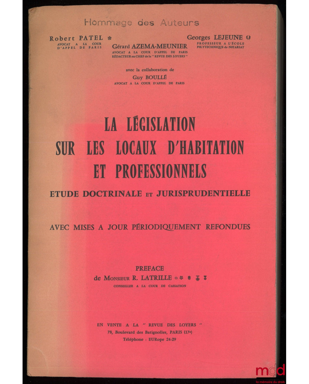 LA LÉGISLATION SUR LES LOCAUX D’HABITATION ET PROFESSIONNELS. Étude doctrinale et jurisprudentielle avec mises à jour périodiquement refondues, Préface de R. Latrille, avec la collaboration de Guy Boullé, accompagné de la MISE À JOUR AU 1er JANVIER 1963
