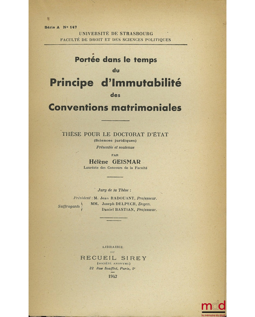 PORTÉE DANS LE TEMPS DU PRINCIPE D’IMMUTABILITÉ DES CONVENTIONS MATRIMONIALES, Université de Strasbourg, Faculté de droit et des sciences politiques, série A n° 147