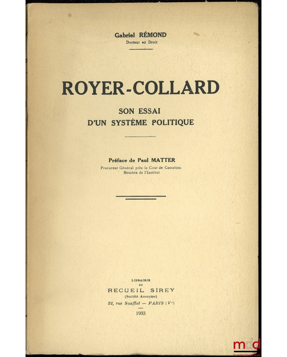 ROYER-COLLARD, SON ESSAI D’UN SYSTÈME POLITIQUE, Préface de Paul Matter