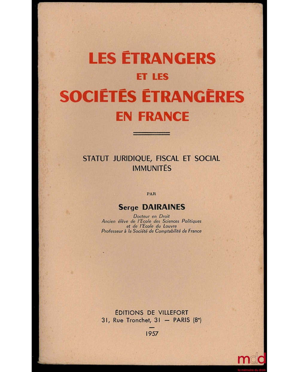 LES ÉTRANGERS ET LES SOCIÉTÉS ÉTRANGÈRES EN FRANCE. Statut juridique, fiscal et social. Immunités