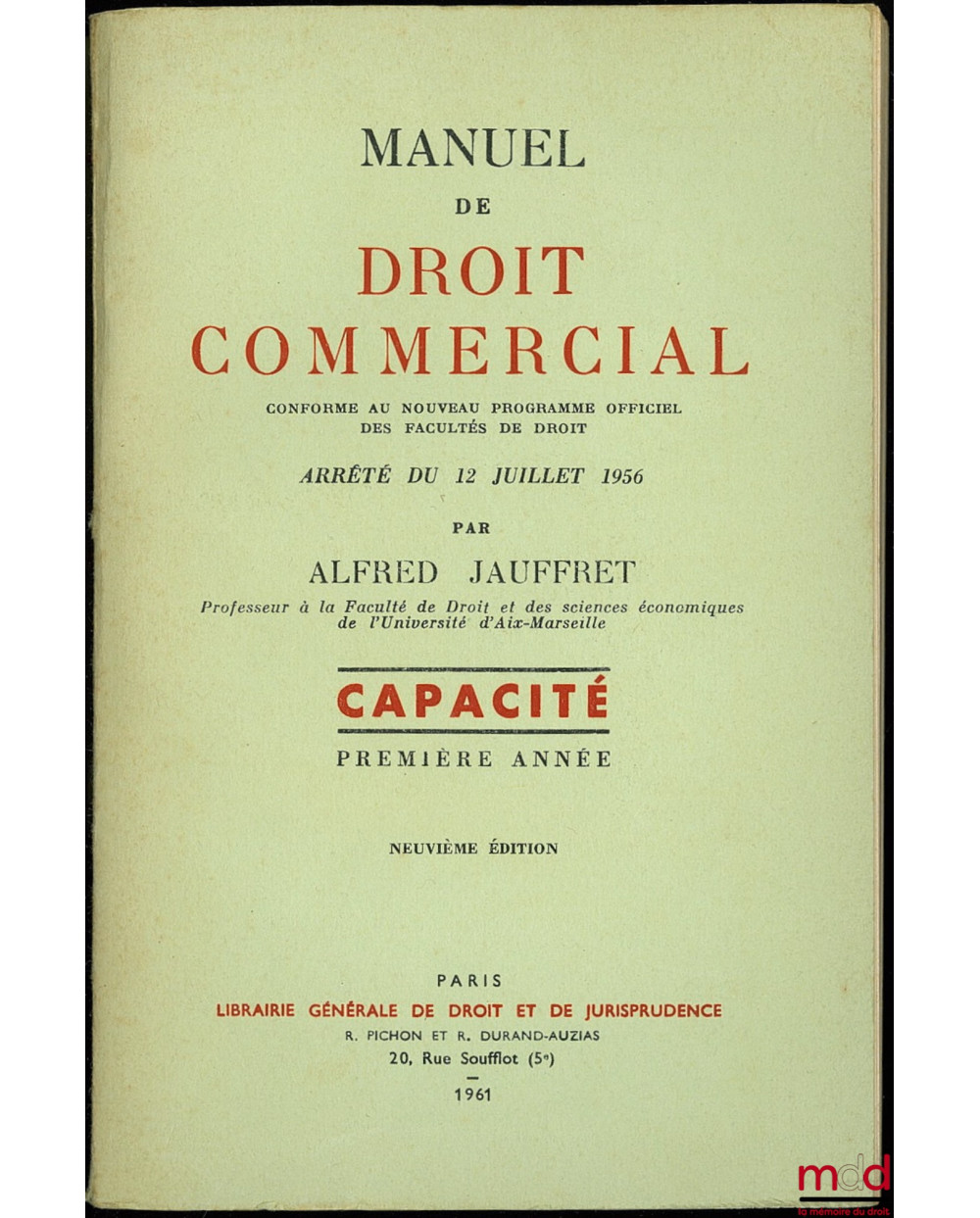 MANUEL DE DROIT COMMERCIAL conforme au nouveau programme officiel des facultés de droit, Arrêté du 12 juillet 1956, Capacité 1re année 9e éd.