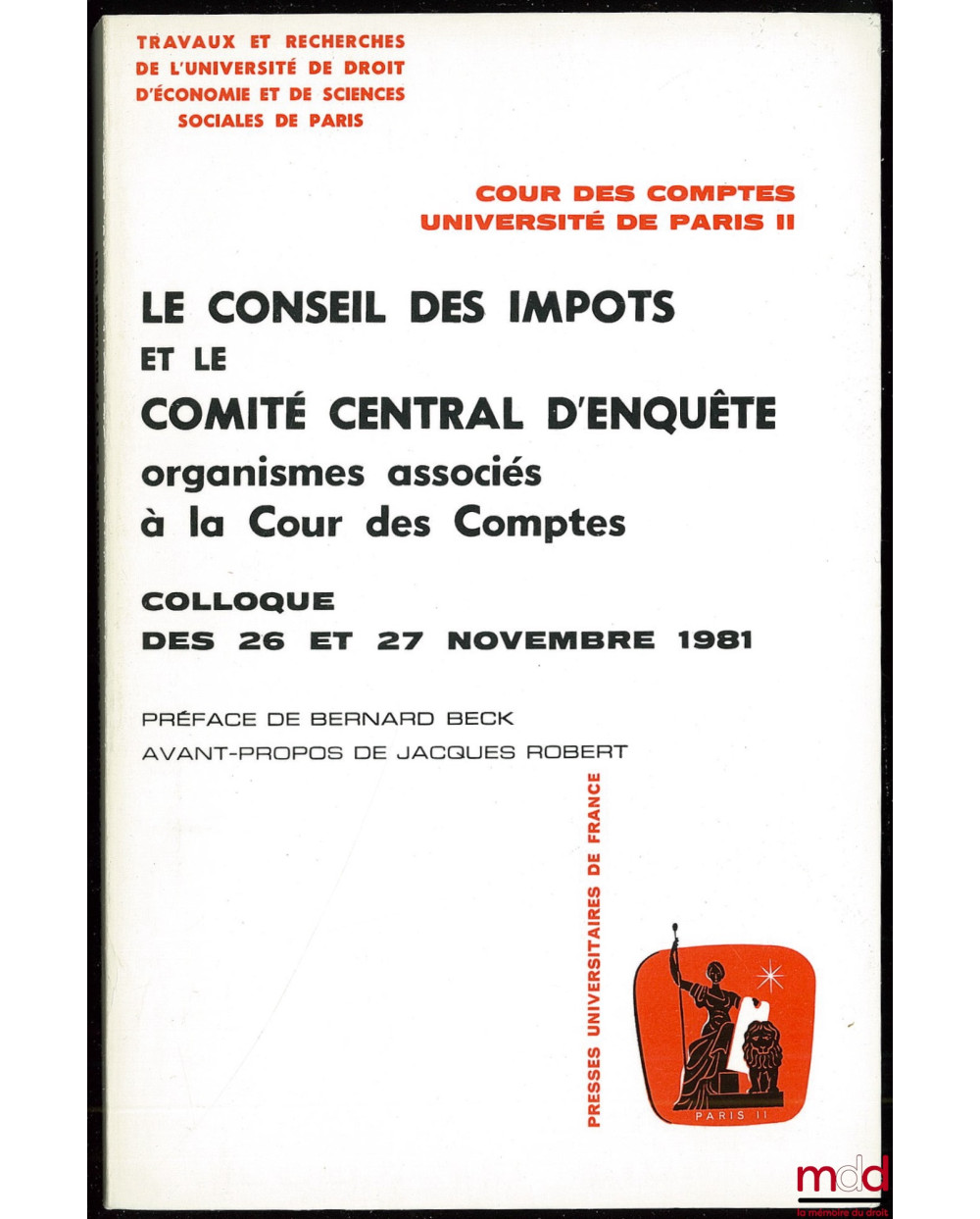 LE CONSEIL DES IMPÔTS ET LE COMITÉ CENTRAL D’ENQUÊTE organismes associés à la Cour des Comptes, Colloque des 26 et 27 nov. 1981, Préface de Bernard Beck, Avant-propos de Jacques Robert, Travaux et recherches de l’université de droit d’économie et de sciences sociales de Paris, Série Science administrative n° 131981