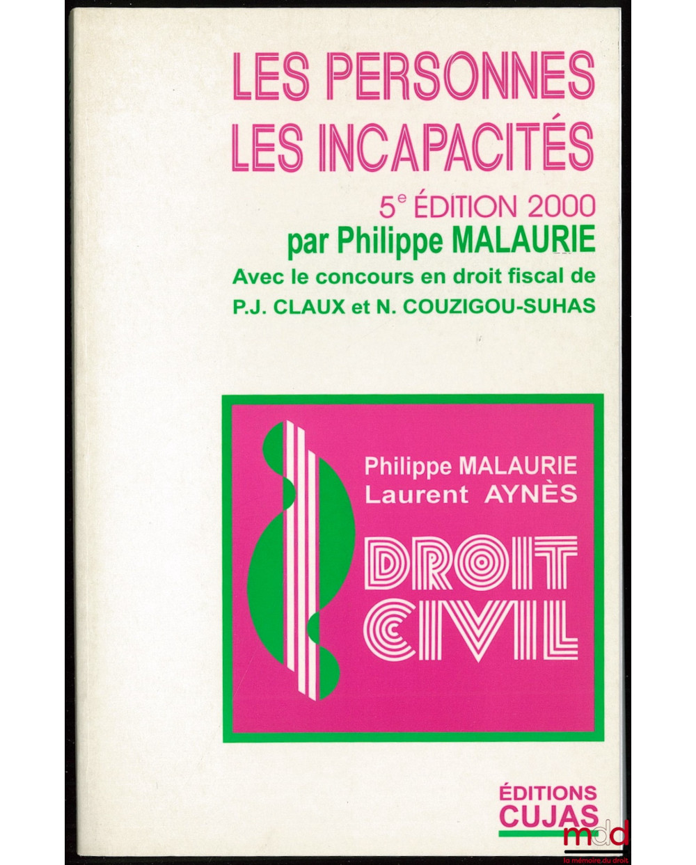 COURS DE DROIT CIVIL, LES PERSONNES - LES INCAPACITÉS, mise à jour au 15 sept. 1999, Avec le concours en droit fiscal de Pierre-Jean Claux, Ouvrage couronné par l’Académie des Sciences Morales et Politiques Prix Dupin Aîné 1992