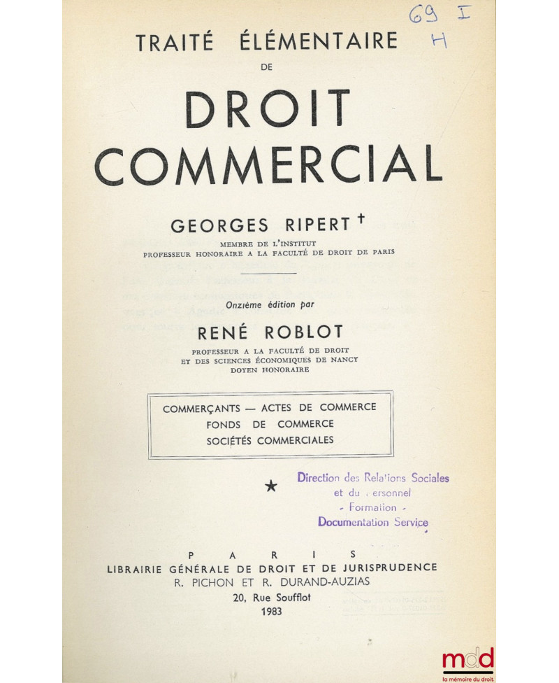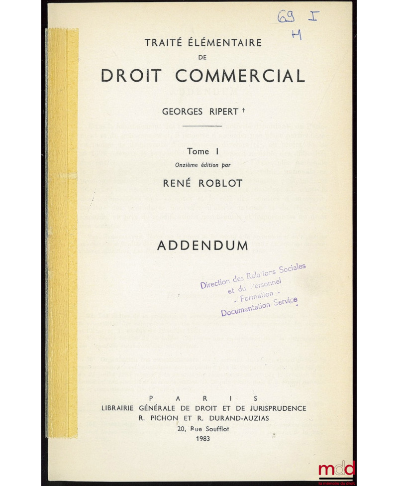TRAITÉ ÉLÉMENTAIRE DE DROIT COMMERCIALt. I (11e éd. avec addendum) : Commerçants - Actes de commerce - Fonds de commerce - Sociétés commerciales ;t. II (10e éd.) : Valeurs mobilières - Effets de commerce - Opérations de banque et de bourse - Contrats commerciaux - Procédures collectives de redressement et de liquidation