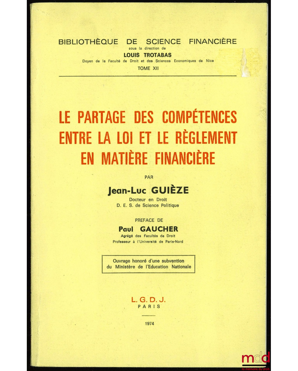 LE PARTAGE DES COMPÉTENCES ENTRE LA LOI ET LE RÈGLEMENT EN MATIÈRE FINANCIÈRE, Préface de Paul Gaucher, Bibl. de science financière, t. XII