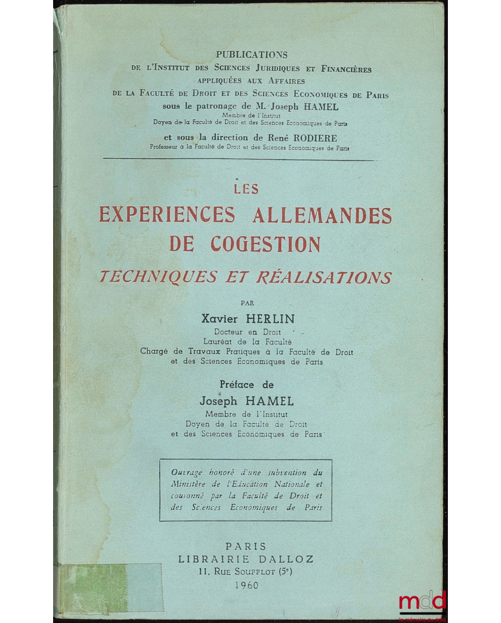 LES EXPÉRIENCES ALLEMANDES DE COGESTION - TECHNIQUES ET RÉALISATIONS, Préface de Joseph Hamel ; Coll. Publications de l’Institut des Sciences Juridiques et Financières appliquées aux Affaires de la Fac. de droit et des sc. éco. de Paris, sous le patronage de Joseph Hamel et sous la direction de René Rodière