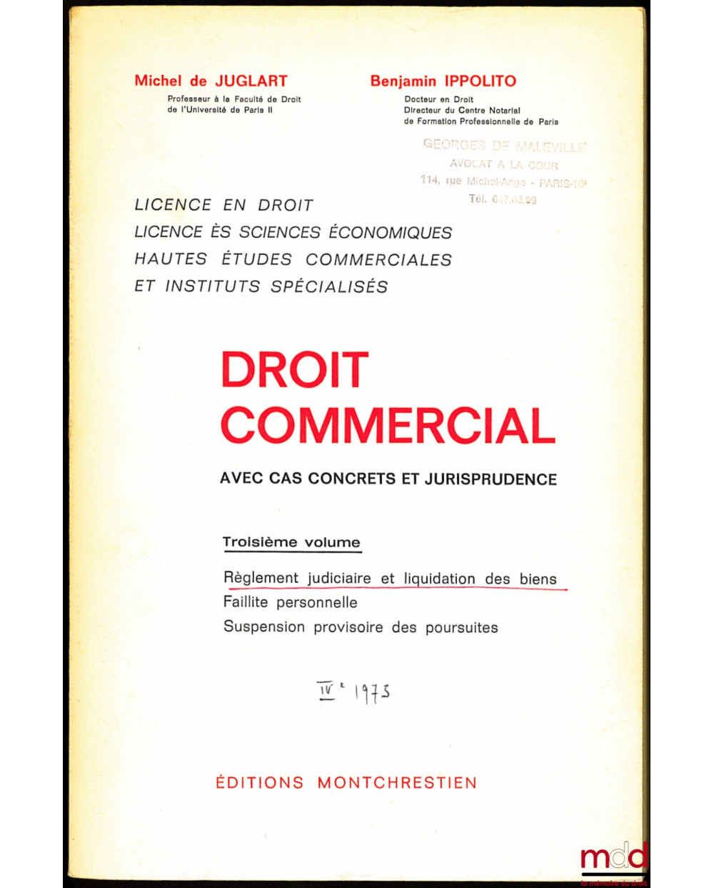 DROIT COMMERCIAL avec cas concrets et jurisprudence, t 3 : Règlement judiciaire et liquidation des biens - Faillite personnelle - Suspension provisoire des poursuites, coll. Licence en droit, licence ès sc. éco., Hautes études commerciales et Instituts spécialisés